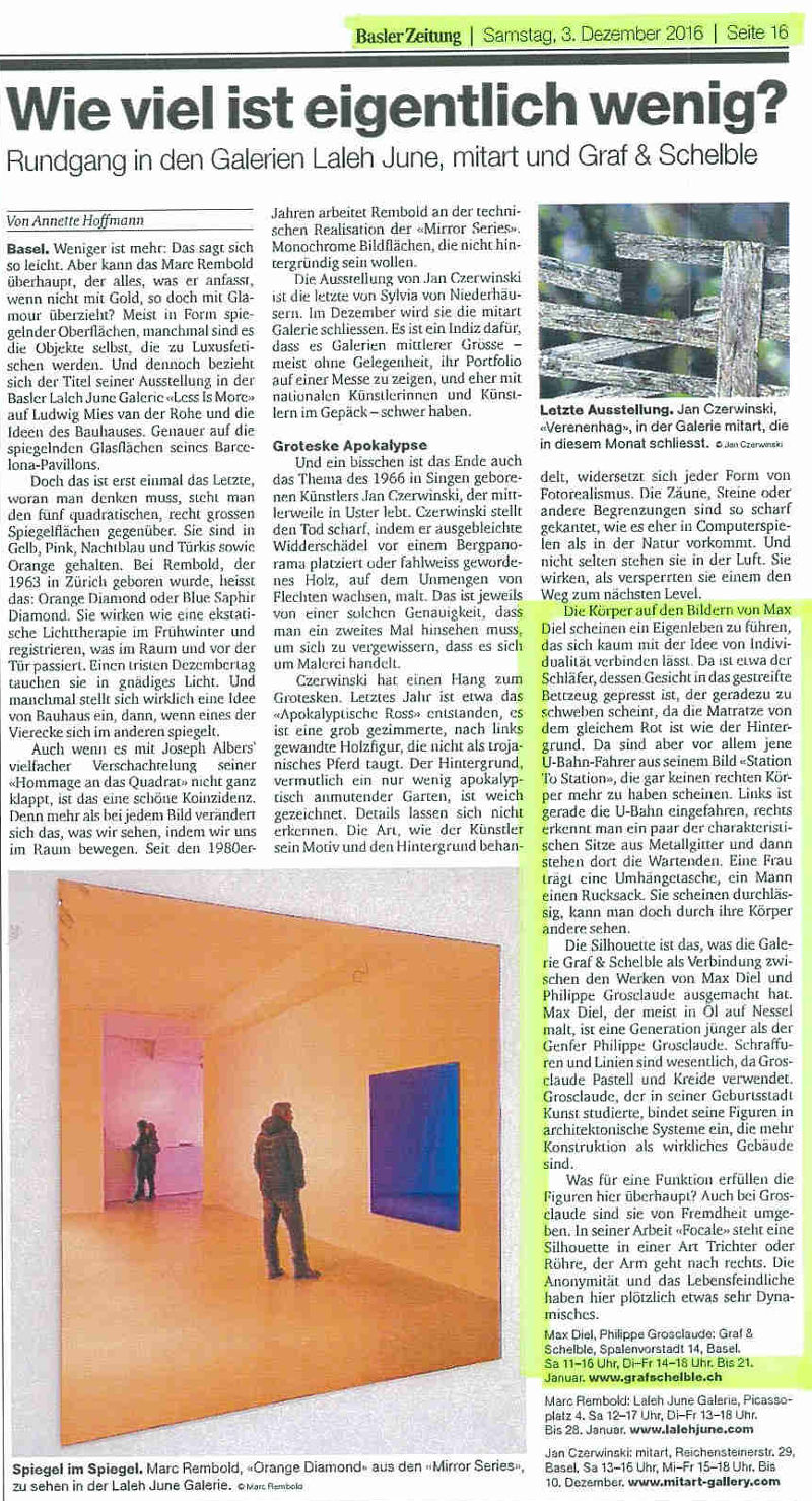 Basler Zeitung, Rundgang in den Galerien Laleh June, mitart und Graf+Schelble, Samstag, 3. Dezember 2016, S.16 Kultur, Text: Annette Hoffmann